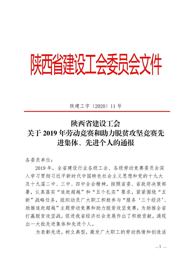 | 公司工會(huì)榮獲“陜西省建設(shè)系統(tǒng)勞動(dòng)競(jìng)賽先進(jìn)集體”稱號(hào) |