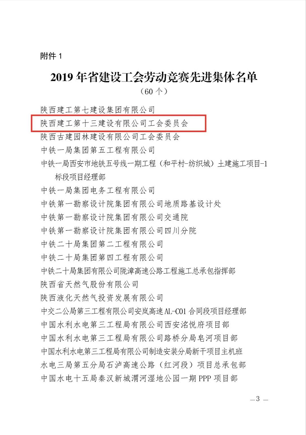 日前,陜西省建設(shè)工會(huì)通報(bào)表彰2019年勞動(dòng)競(jìng)賽和助力脫貧攻堅(jiān)競(jìng)賽先進(jìn)集體、先進(jìn)個(gè)人。陜建十三建公司工會(huì)委員會(huì)榮獲“2019年陜西省建設(shè)系統(tǒng)勞動(dòng)競(jìng)賽先進(jìn)集體”稱號(hào)。