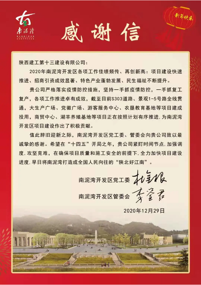 感謝信中提到,2020年陜建十三建公司嚴格落實疫情防控措施,堅持一手抓疫情防控,一手抓復工復產(chǎn),各項工作推進卓有成效,截止目前S303道路、景觀1-5號路全線貫通,大生產(chǎn)廣場、黨徽廣場、游客服務中心、農(nóng)墾教育基地等項目建成投用,商貿(mào)中心、湖羊養(yǎng)殖基地等項目正在按照計劃有序推進,為南泥灣開發(fā)區(qū)項目建設(shè)作出了積極貢獻。