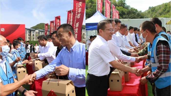 慰問(wèn)活動(dòng)現(xiàn)場(chǎng),與會(huì)領(lǐng)導(dǎo)為農(nóng)民工朋友們發(fā)放慰問(wèn)品,并隨后觀看了“慶豐收、感黨恩”慰問(wèn)演出。