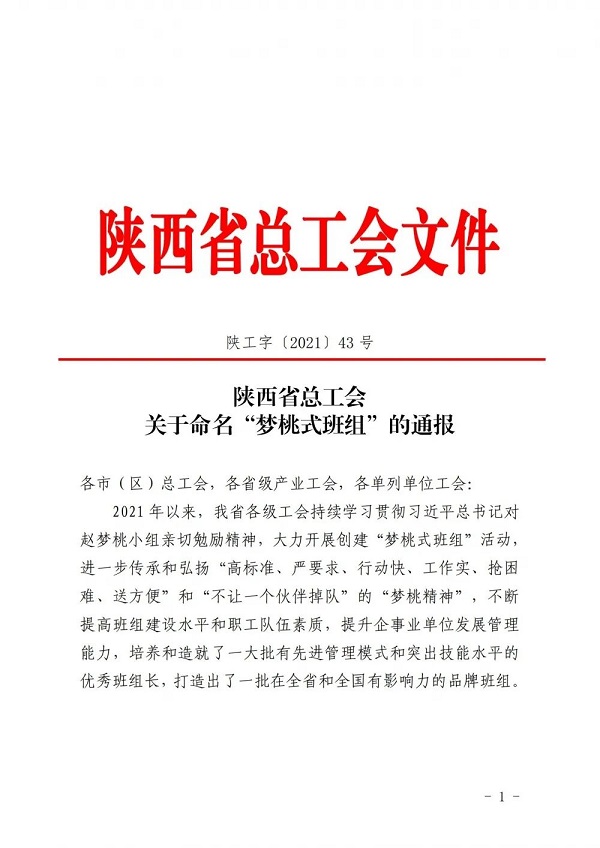 為進一步傳承和弘揚“高標準、嚴要求、行動快、工作實、搶困難、送方便”和“不讓一個伙伴掉隊”的“夢桃精神”,近日,陜西省總工會對全省50個優(yōu)秀班組進行了榮譽表彰,授予他們“夢桃式班組”榮譽稱號,集團延安南泥灣勞模工匠學院項目科技創(chuàng)新班組獲此殊榮。