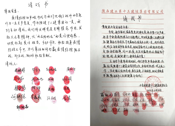 為了積極應(yīng)對嚴峻的疫情防控形勢,在陜建十三建集團黨委的號召下,全體黨員干部、團員青年、90后、00后紛紛遞交請戰(zhàn)書,請愿赴一線服務(wù)疫情防控工作,助力延安市打贏疫情防控阻擊戰(zhàn)、殲滅戰(zhàn)。