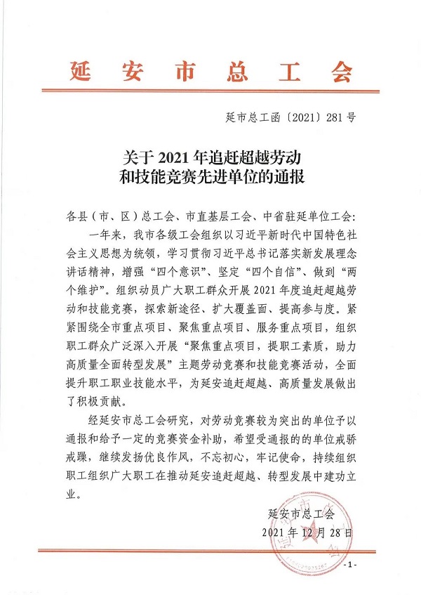 近日,延安市總工會(huì)公布了2021年追趕超越勞動(dòng)和技能競賽先進(jìn)單位名單。陜建十三建集團(tuán)榮獲延安市2021年追趕超越勞動(dòng)和技能競賽先進(jìn)單位。