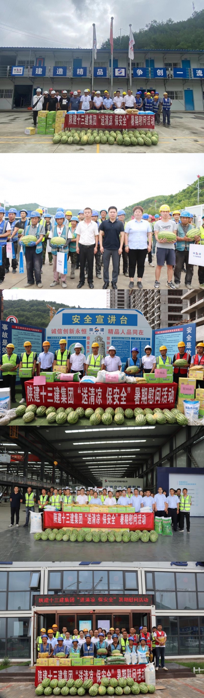 集團(tuán)總工程師王弘起,副總經(jīng)理?xiàng)钣篮辏笨偨?jīng)理張?chǎng)蝹?,總?huì)計(jì)師劉小衛(wèi),紀(jì)委書(shū)記、工會(huì)主席李靜分別前往延安市社會(huì)福利院遷建項(xiàng)目(一期)、延安南泥灣工匠學(xué)院項(xiàng)目、伴山樾谷·芳菲里項(xiàng)目、延安新型建材公司、信天游文創(chuàng)餐飲街區(qū)等項(xiàng)目開(kāi)展慰問(wèn)活動(dòng),代表集團(tuán)公司對(duì)高溫天氣堅(jiān)守在一線的廣大員工及工友表示親切的問(wèn)候和衷心的感謝,并為大家送上西瓜、白糖、綠豆、菊花、冰糖、飲料、花露水等防暑降溫物品。同時(shí),叮囑項(xiàng)目部要始終把安全放在首位,科學(xué)安排施工作業(yè)時(shí)間,做好后勤保障工作,制定防暑防汛工作預(yù)案,在確保一線施工作業(yè)人員健康安全的前提下抓質(zhì)量提進(jìn)度,緊盯項(xiàng)目節(jié)點(diǎn)目標(biāo),圓滿完成各項(xiàng)建設(shè)任務(wù)。