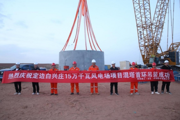 近日,集團(tuán)新型建材公司為中材海外榆林定邊白興莊150MW風(fēng)電場項目生產(chǎn)的混凝土塔筒管片首環(huán)吊裝順利完成。